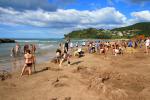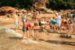 Von dort ging es dann weiter zur Coromandel Halbinsel zum „hot water beach“ (Danke Francis und Dennis für den Tipp!!) wir warteten auf die Ebbe und mieteten uns eine Schaufel 😉 damit ging es dann auf zum Strand und da war schon die Hölle los! Der Strand war schon sehr gut bevölkert, denn hier strömen heiße Quellen bei Ebbe aus der Erde und man kann sich seine eigene Badewanne ausgraben 🙂 Da die Quellen aber bis zu 60 Grad heiß sein können muss man auch aufpassen, dass man sich nicht den Popo oder die Füße verbrüht. Wir beobachten erst einmal eine Weile das Schauspiel und kamen uns fast ein bisschen wie auf einem großen Spielplatz vor. Dann versuchten auch wir unser Glück… Erst fanden wir kein warmes Plätzchen, doch dann sprudelte es gleich richtig heiß aus der Erde!! Wir haben wohl eine der Hauptquellen angegraben 😉 es war ein lustiger Nachmittag und man staunt wie man erwachsene Menschen (besonders die Männer) mit ner Schaufel und nem großen Buddelkasten begeistern kann 😉