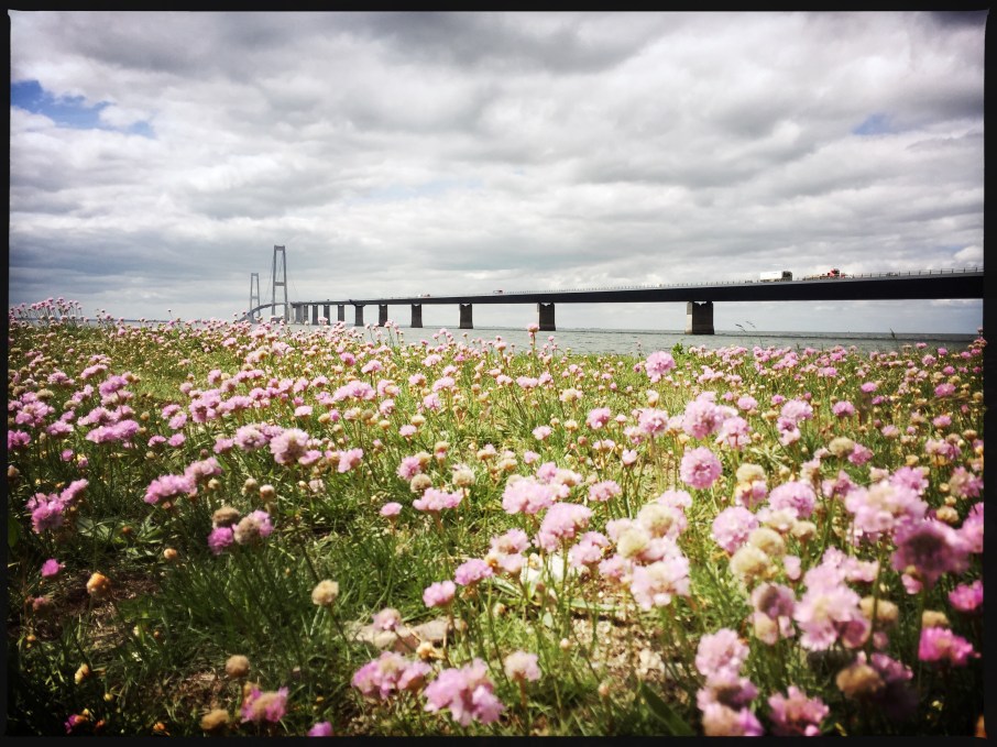 Am Nachmittag holten wir die leider glücklosen Angler vom Hafen ab und trösteten uns mit einem leckeren Softeis. Am Abend gabs dann noch einen Hotdog und Fischburger am Hafen und so endete ein weiterer schöner Tag unserer Reise. Am nächsten Morgen drehten wir auf Wunsch des kleinen Hundenarren Felix wieder eine Runde mit Paula und danach brachen wir langsam auf. Wir fuhren nach Nyborg und überquerten dort den großen Belt über die Størebelt Brücke, eine der längsten Hängebrücken der Welt. In bis zu 65 m Höhe, 18 Km quer über die Ostsee – Wahnsinn! Am anderen Ende erwartete uns dann ein toller Blick zurück auf die Brücke.