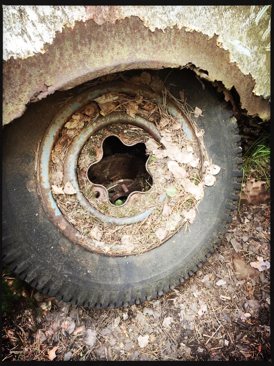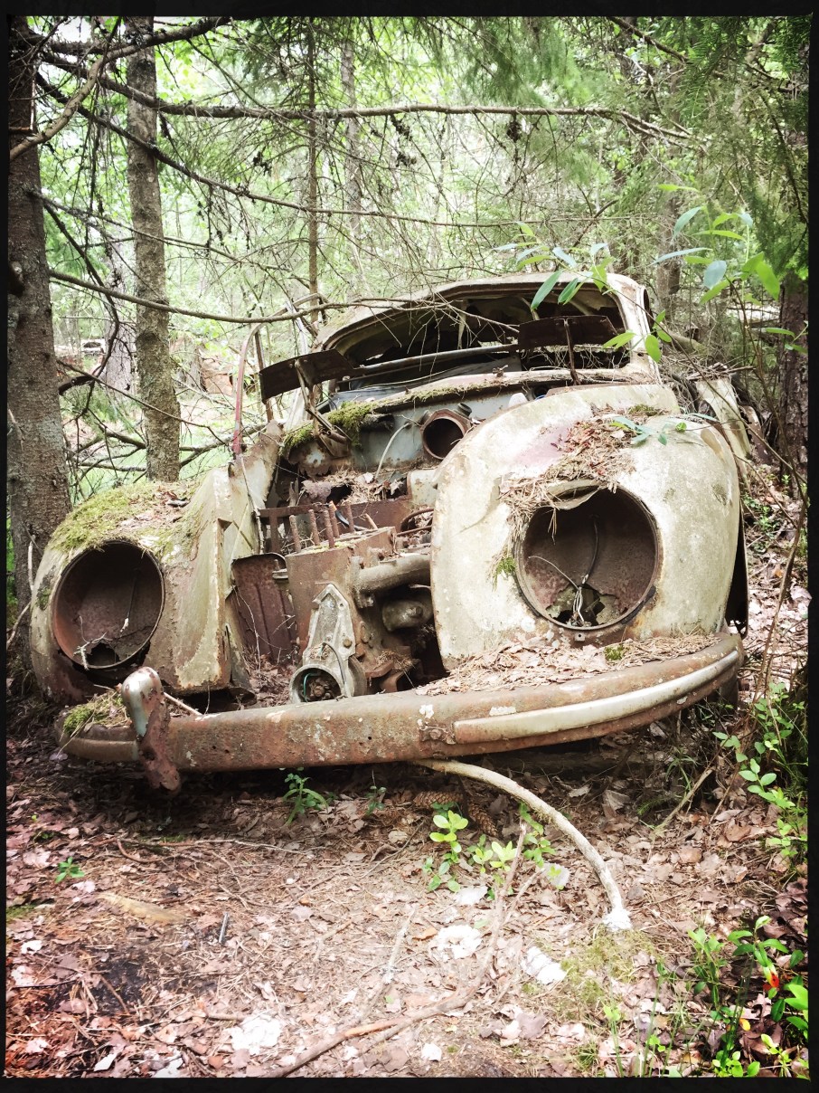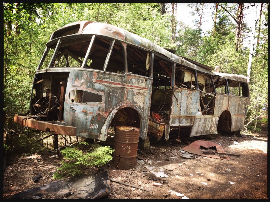 Die Stimmung hier nahm uns gleich in Beschlag, denn die Stille der Natur steht in einem scharfen Kontrast zu den Spuren, die der Mensch hinterlassen hat. Hier liegen ca. 100 Autowracks im Wald verstreut… Langsam aber sicher übernehmen Büsche und Bäume wieder die Herrschaft und es wird nicht mehr lange dauern bis die Vegetation die alten Schrottlauben gänzlich unter sich begraben hat.